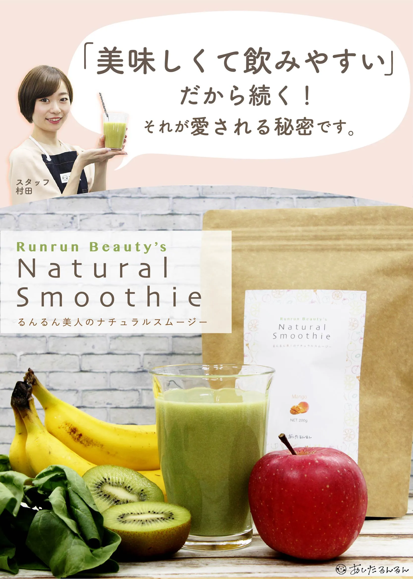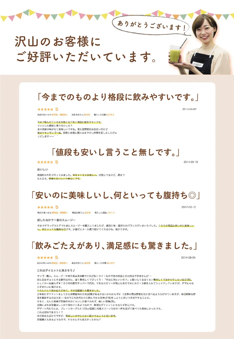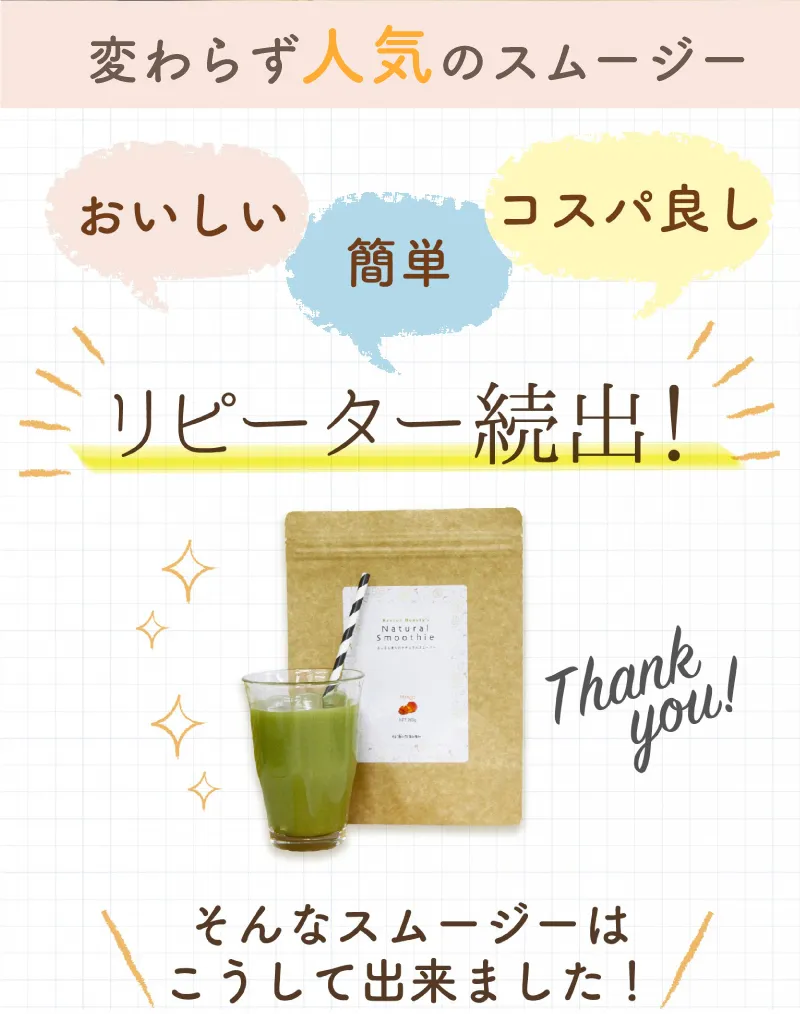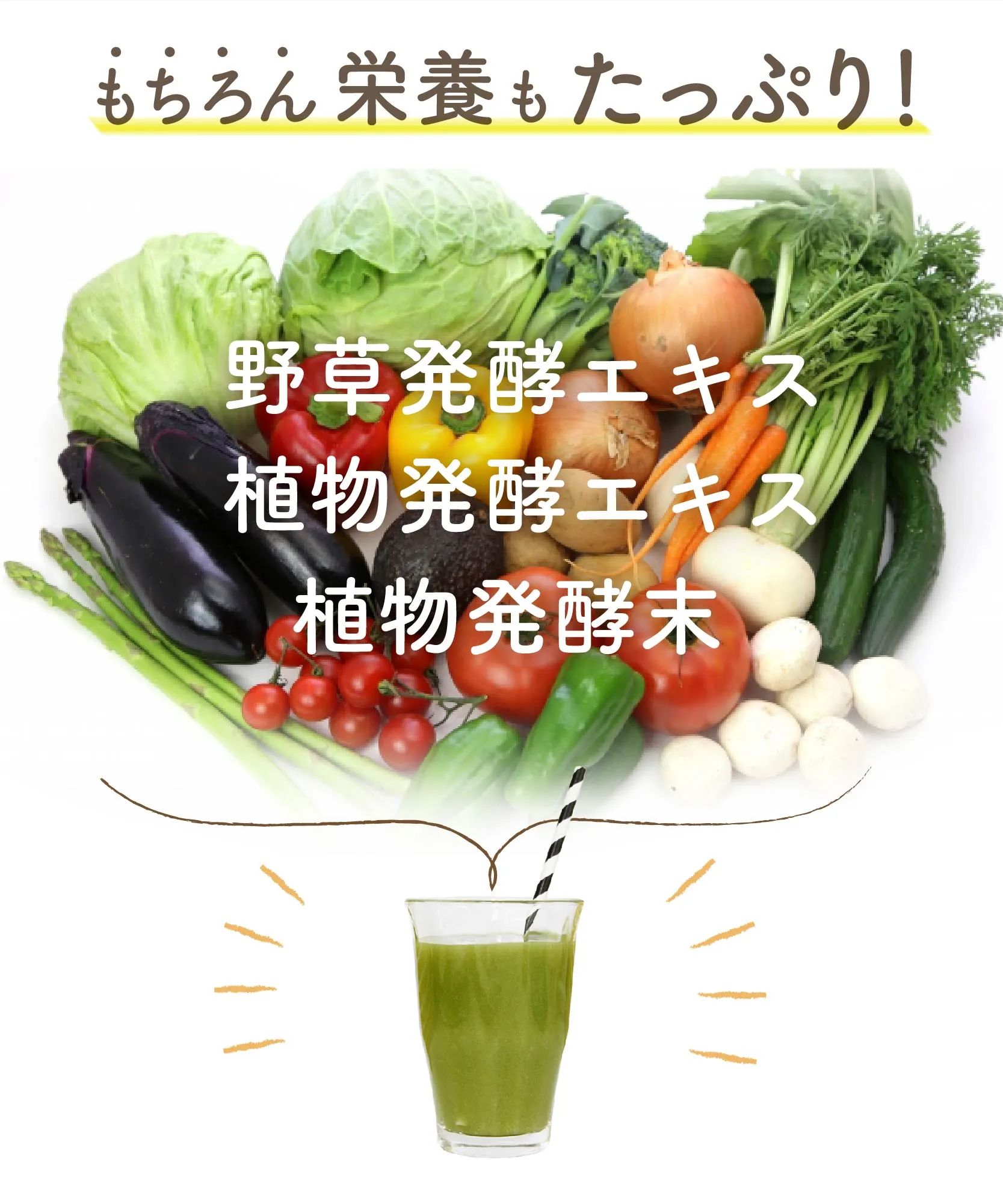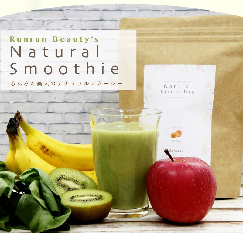 水溶性食物繊維、脱脂粉乳、大麦若葉、ドロマイト、コンニャク芋イモ抽出物、食用酵母(マンガン、モリブデン、クロム、亜鉛、銅、セレン含有)、野草醗酵エキス(ヨモギ、スギナ、ビワヨウ、ラカンカ、ドクダミ、キダチアロエ、クコの実、ハトムギ、その他)、植物発酵末(デキストリン、黒糖、オレンジ、パイナップル、バナナ、リンゴ、パパイア、その他)、植物発酵エキス(デキストリン、てんさい糖、黒砂糖、麦芽糖、よもぎ、ウコン、ドクダミ、その他)、サイリウムハスク、キサンタンガム、クエン酸、香料、アルギン酸ナトリウム、甘味料(アスパルテーム・L-フェニルアラニン化合物)、ビタミンC、ナイアシン、ビタミンE、パントテン酸Ca、ビタミンB2、ビタミンB1、ビタミンB6、ビタミンA、葉酸、ビタミンD、ビタミンB12(一部にオレンジ・カシューナッツ・キウイフルーツ・ごま・大豆・ヤマイモ・バナナ、リンゴを含む)