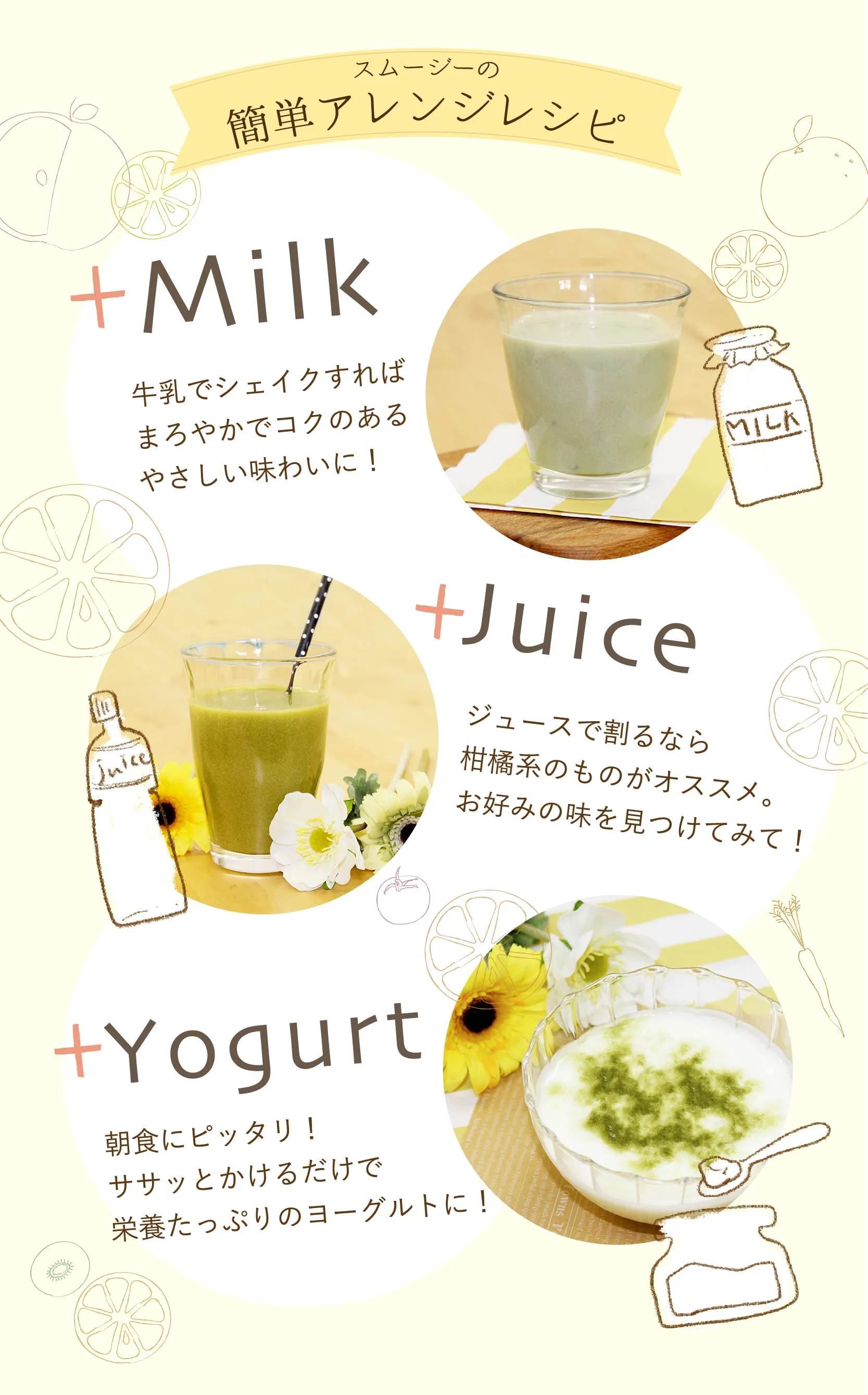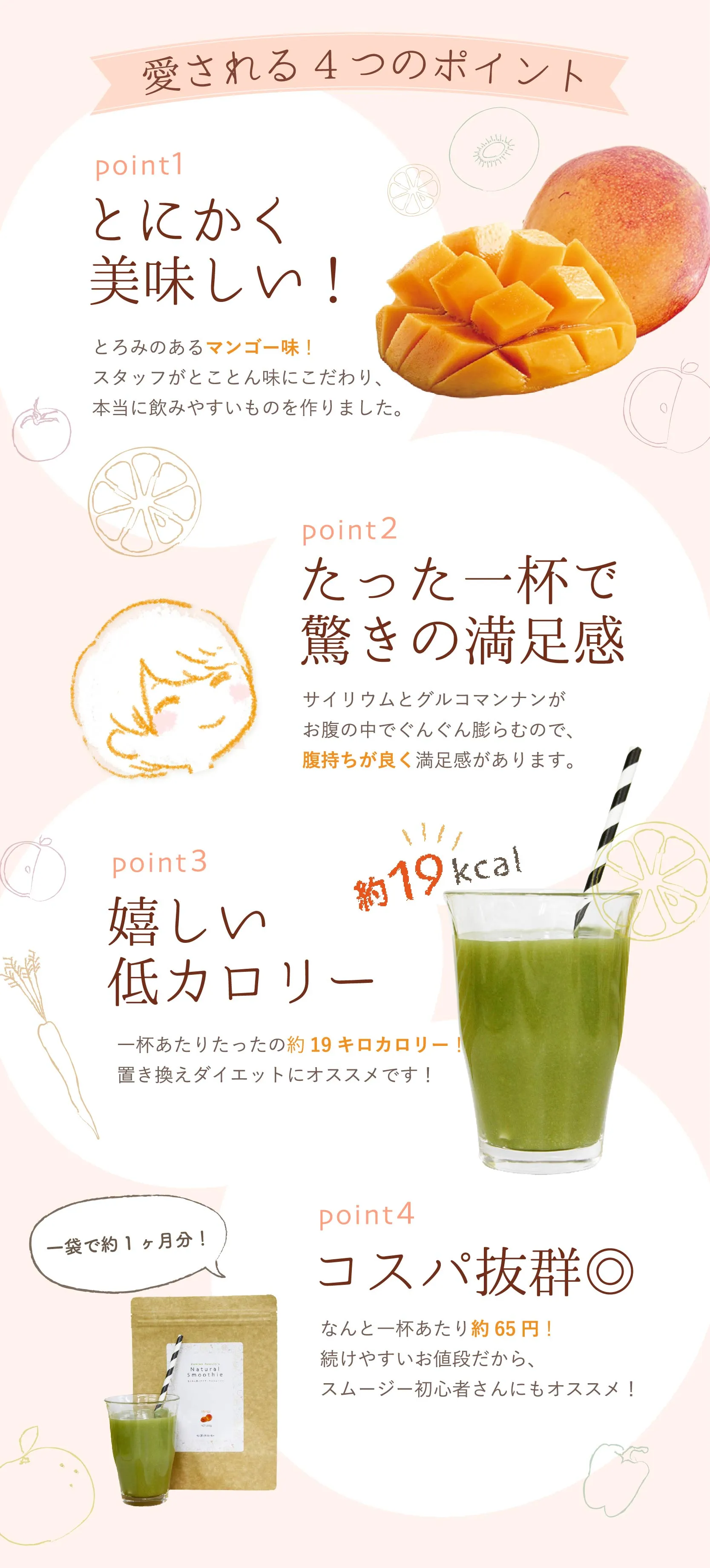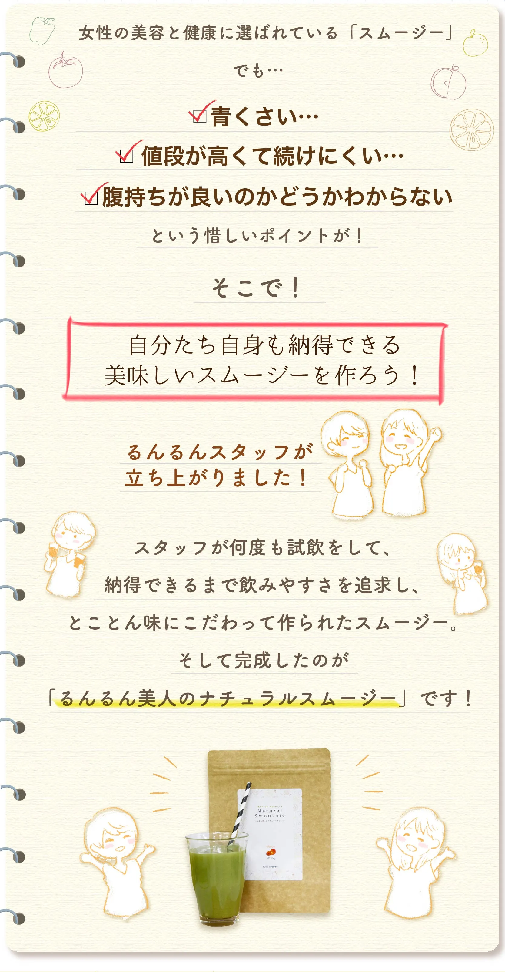 水溶性食物繊維、脱脂粉乳、大麦若葉、ドロマイト、コンニャク芋イモ抽出物、食用酵母(マンガン、モリブデン、クロム、亜鉛、銅、セレン含有)、野草醗酵エキス(ヨモギ、スギナ、ビワヨウ、ラカンカ、ドクダミ、キダチアロエ、クコの実、ハトムギ、その他)、植物発酵末(デキストリン、黒糖、オレンジ、パイナップル、バナナ、リンゴ、パパイア、その他)、植物発酵エキス(デキストリン、てんさい糖、黒砂糖、麦芽糖、よもぎ、ウコン、ドクダミ、その他)、サイリウムハスク、キサンタンガム、クエン酸、香料、アルギン酸ナトリウム、甘味料(アスパルテーム・L-フェニルアラニン化合物)、ビタミンC、ナイアシン、ビタミンE、パントテン酸Ca、ビタミンB2、ビタミンB1、ビタミンB6、ビタミンA、葉酸、ビタミンD、ビタミンB12(一部にオレンジ・カシューナッツ・キウイフルーツ・ごま・大豆・ヤマイモ・バナナ、リンゴを含む)