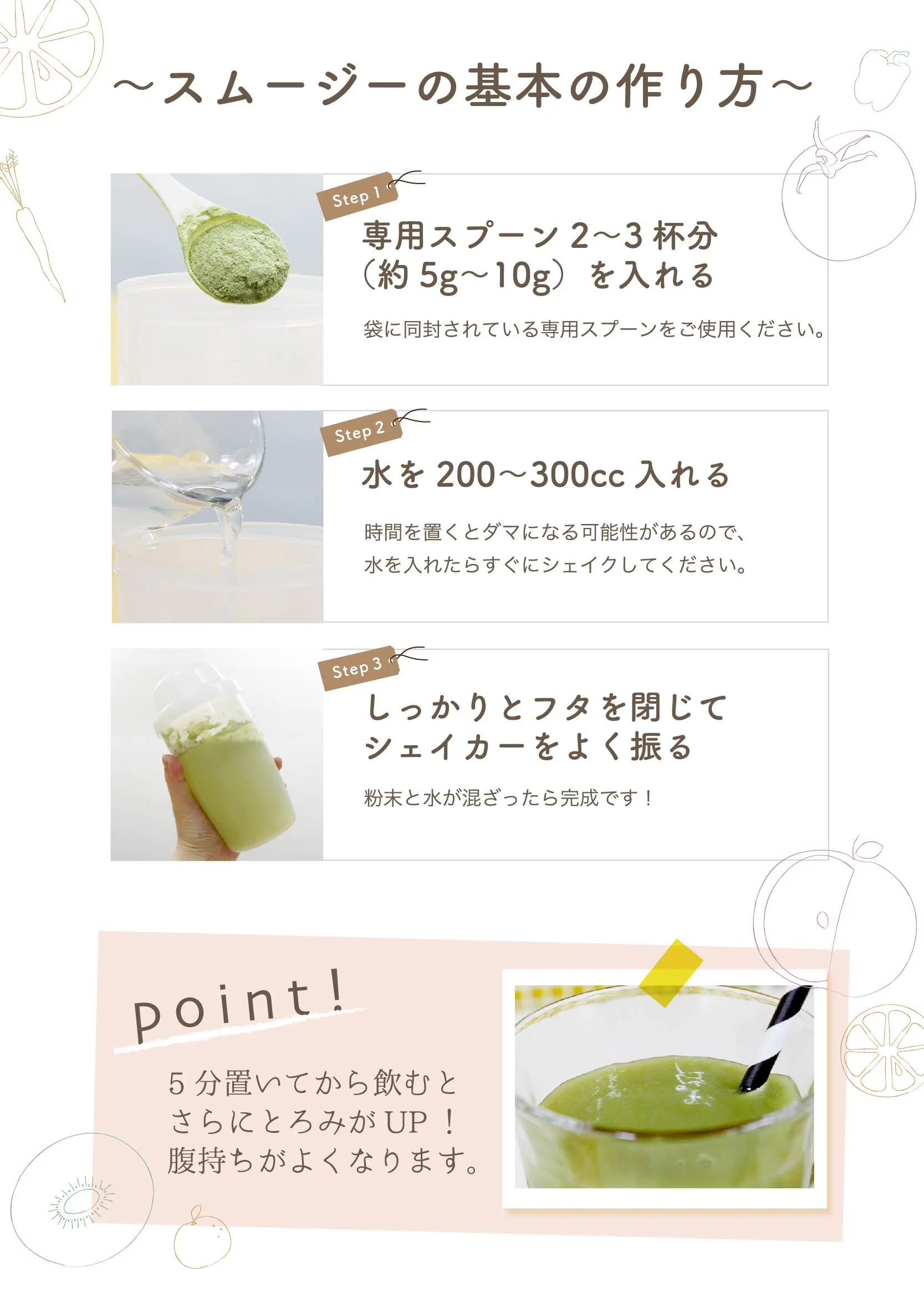 栄養補助食品としてまずはシェイカーに水または牛乳などを約100cc~200cc位まで注ぎ、その後、本品粉末を付属のスプーン5g~10g(約2~3杯分)を入れて、よく振り混ぜてからお召し上がりください。